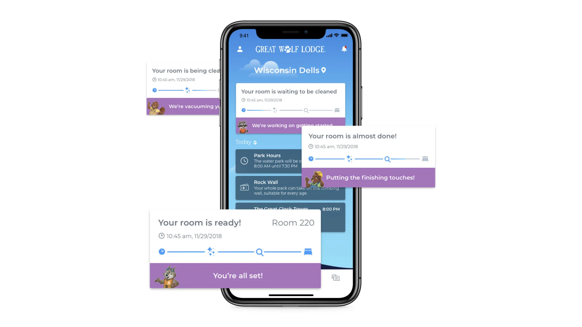 As lead visual designer on the team, I designed the UI of the application. I also led user testing sessions and conducted ethnographic research at three lodges in order to get buy-in from our stakeholders and build the right thing. I advocated for surprise and delight features such as the inclusion of Great Wolf’s suite of characters and micro-interactions. The decision to incorporate these fun characters helped build a connection between a digital product and the physical experience of being at the lodge.